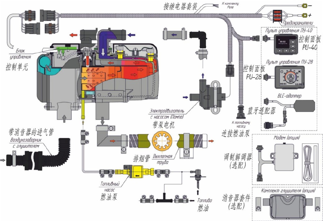 独立式预热启动加热器可接入交通工具的冷却系统,若用于露营车、游艇及船舶,也能连接内部液体供暖系统。工作时,空气先经进气管进入液体预热器的燃烧室,再与计量燃油泵输送的燃油混合,形成可燃混合气。随后,点火塞启动点燃混合气,触发燃烧过程,实现热交换器的加热。紧接着,加热器的电动泵会驱动受热后的液体,在发动机与车辆原配供暖系统的散热器间循环。
